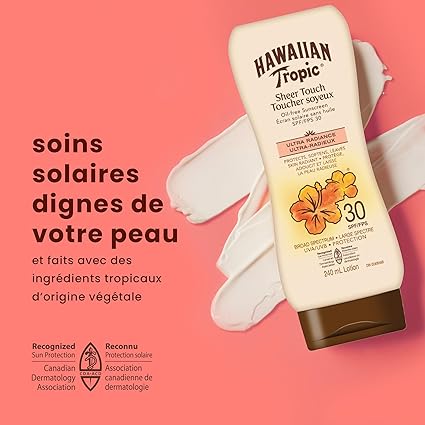 Protect and nourish your skin with Hawaiian Tropic Sheer Touch Sunscreen Lotion SPF 50+. This lightweight, non-greasy formula provides broad-spectrum UVA/UVB protection while leaving skin feeling soft and radiant. Infused with tropical botanicals, it has a pleasant fragrance and is water-resistant, making it perfect for beach days, outdoor activities, or daily sun care.